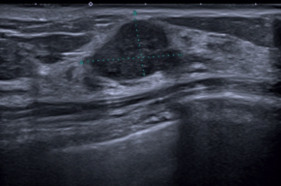 En mai 2023, la patiente refait un bilan dans un autre centre. La mammographie est décrite comme normale, sein très dense de type D mais présence de formations hypoéchogènes classées ACR 3.